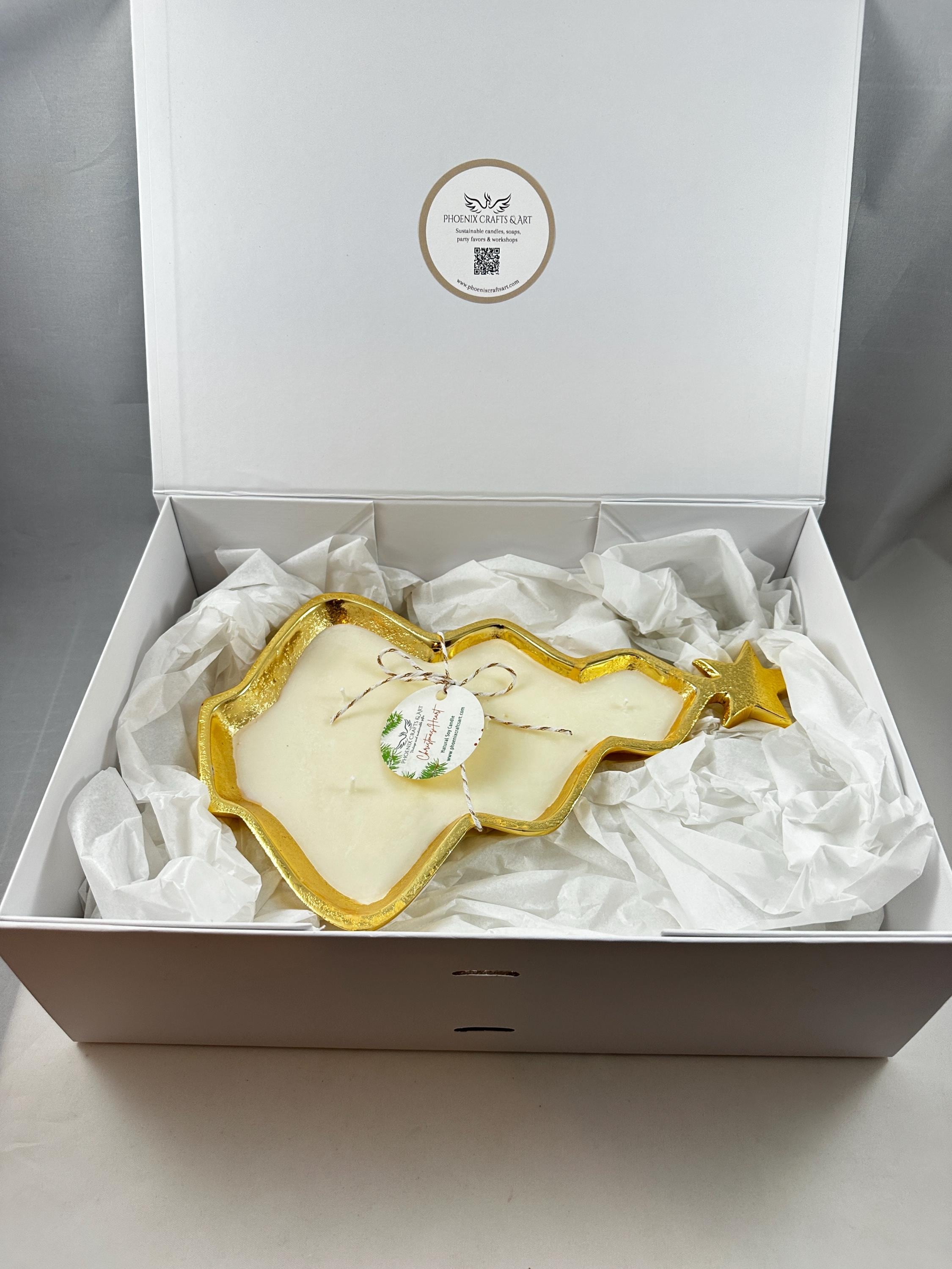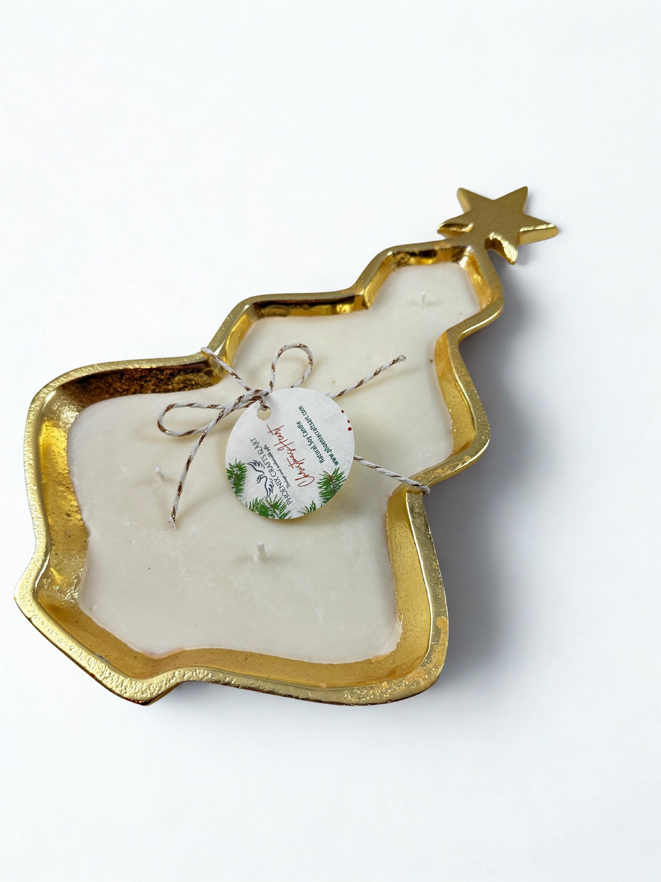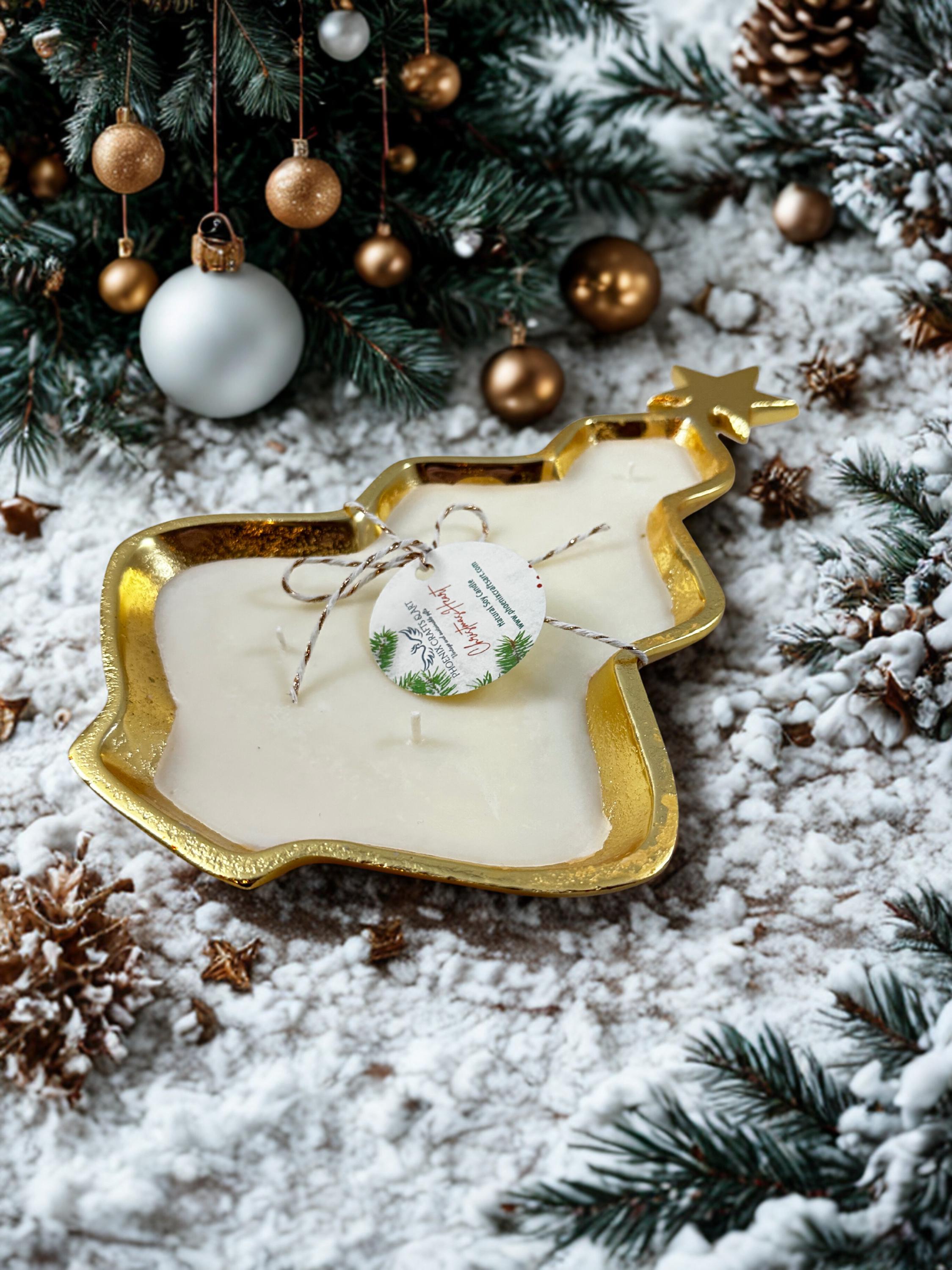 This a delicate and mesmerizing Christmas tree natural soy wax candle hand-poured in a metal gold tray. Perfect to set the Xmas spirit, its fragrance combines orange spice, fir and pine notes, and it is a non toxic and 100% natural product handcrafted in small batches in my studio in Connecticut, USA.