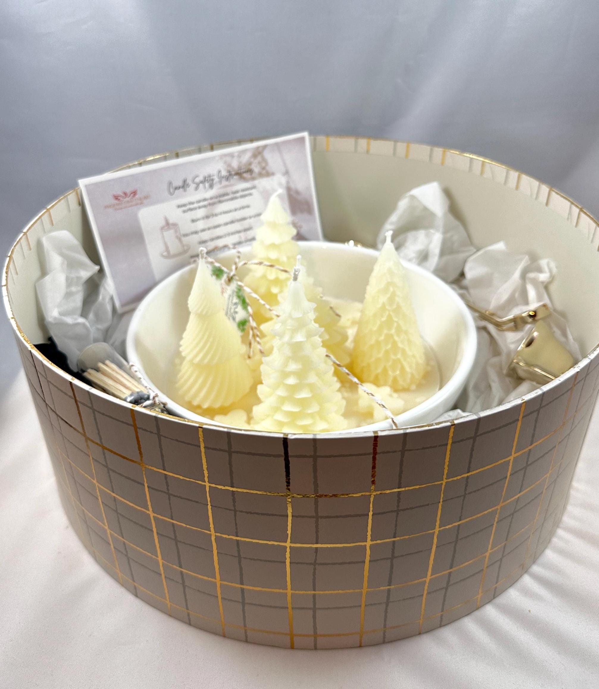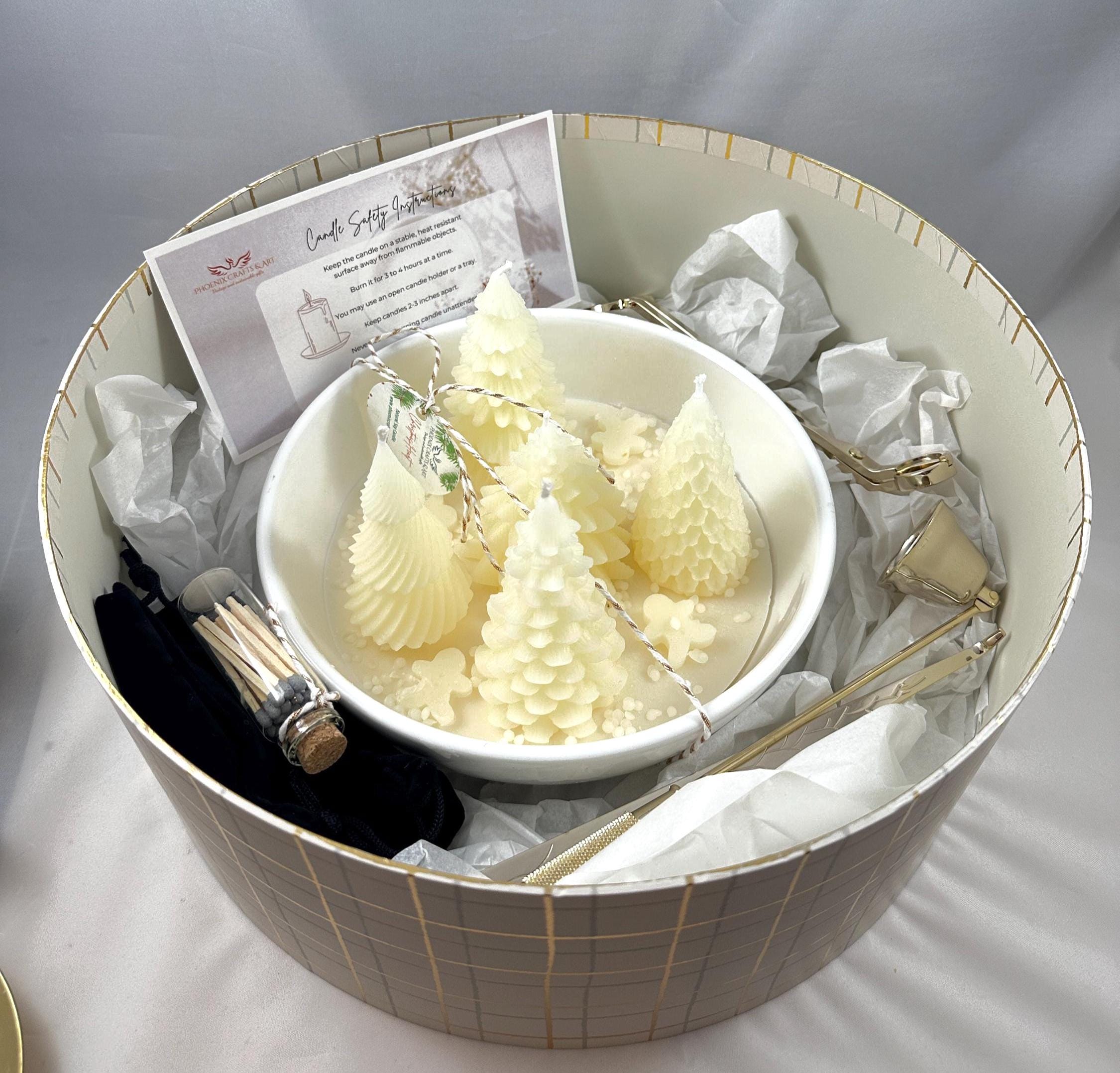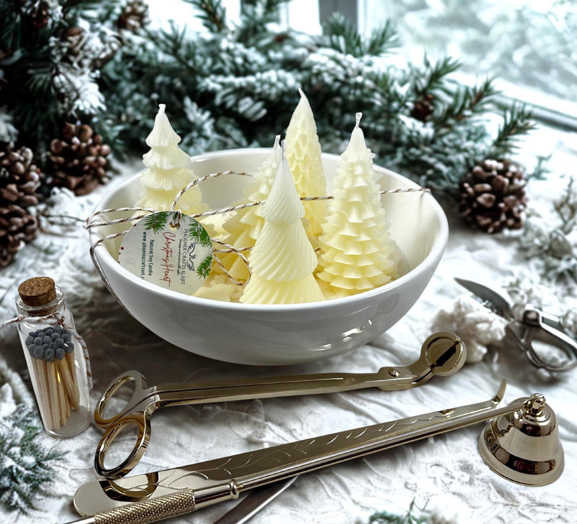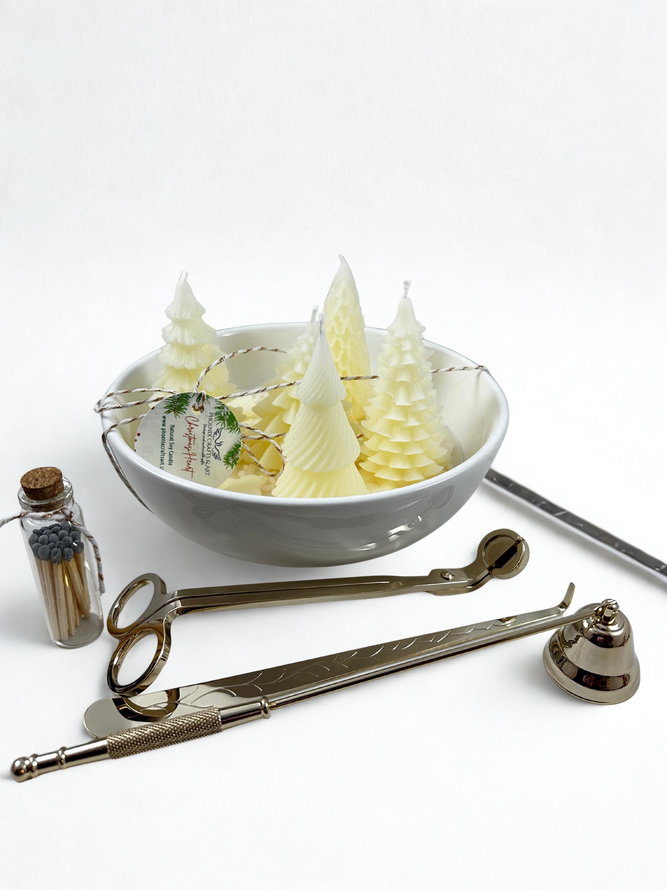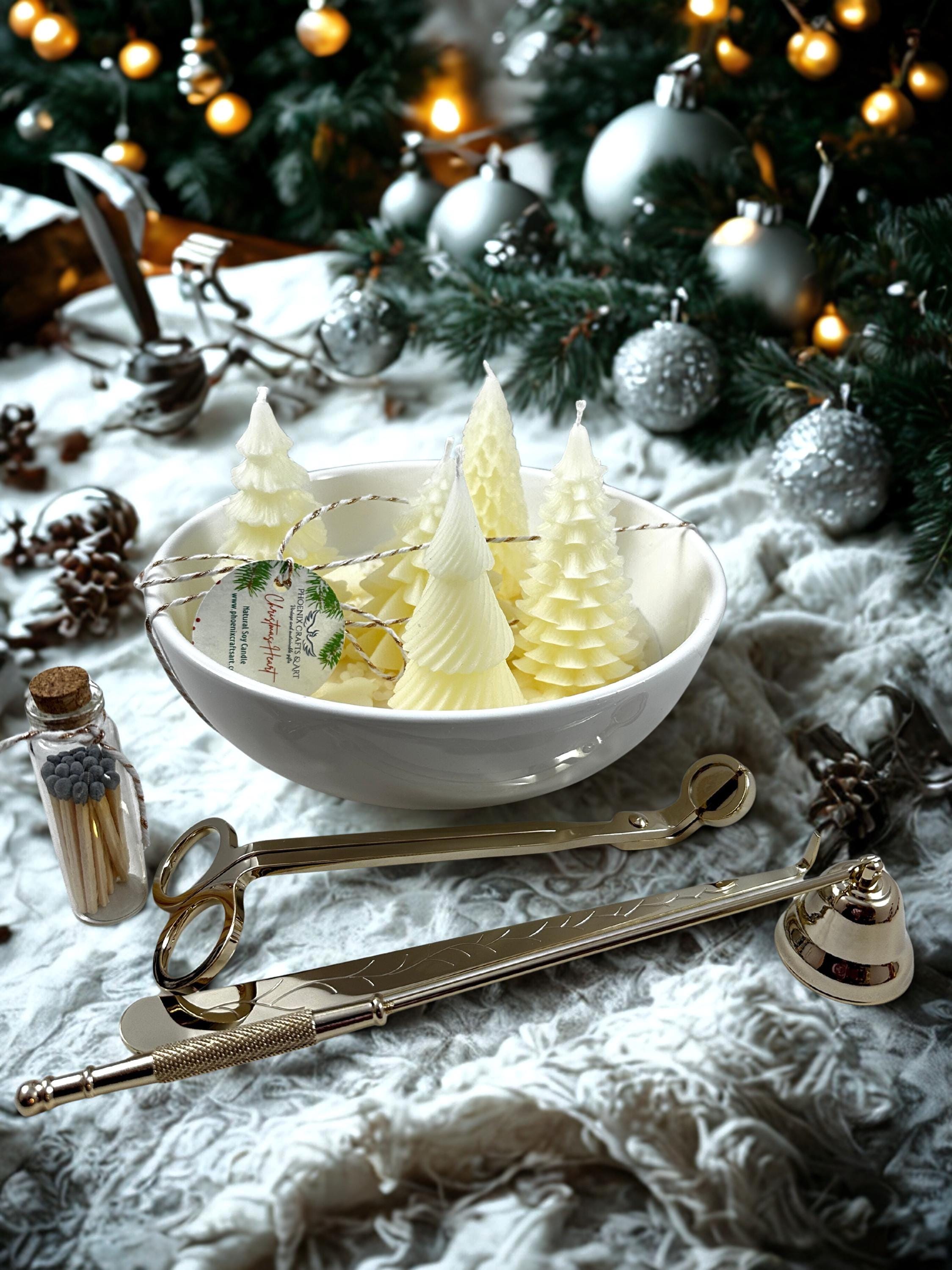 This minimalist Winter Christmas soy and bee wax candle was hand-poured in a Portuguese porcelain plate. The candle comes with a gold trim set, with Snuffer, Trimmer, and Wick Picker - for a full and relaxing candle experience. To complete the perfect gift, it includes a gold round paper box.