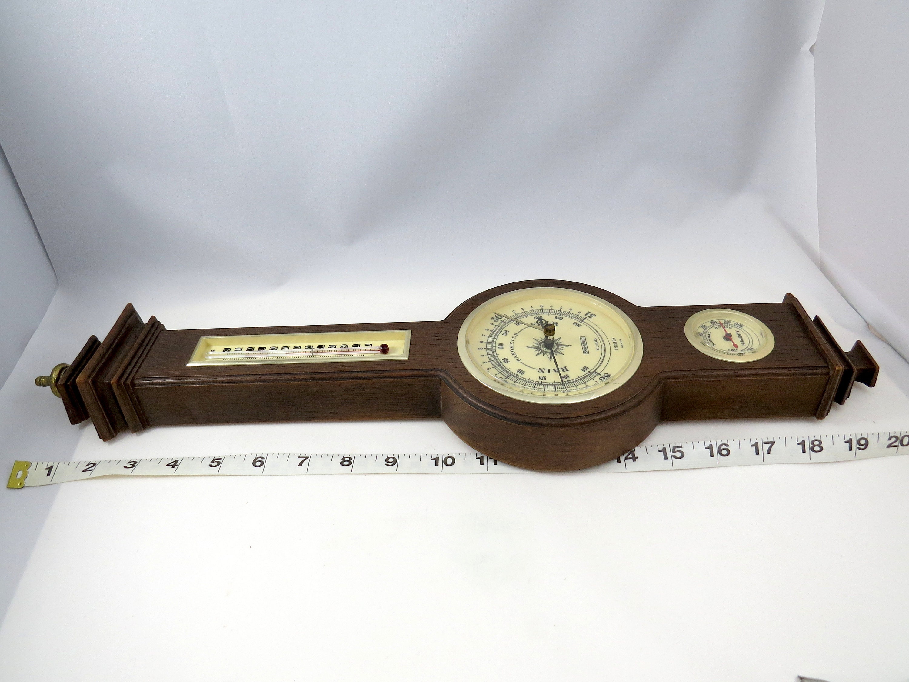 For your consideration, this is a vintage style barometer instrument perfect for wall décor. This is made in plastic, metal and wood pieces. In good condition, it doesn't have significant sign of use, just need new batteries.